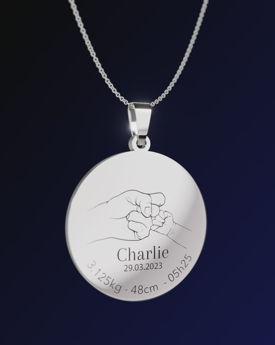 Pour célébrer cet événement merveilleux, quoi de mieux qu'un bijou personnalisé pour vous rappeler à jamais ce jour spécial ? Ce collier de naissance est le cadeau parfait pour les nouvelles mamans. Il est orné d'un pendentif mignon représentant un bébé, avec le prénom, la date et l'heure de naissance de votre enfant gravé.
